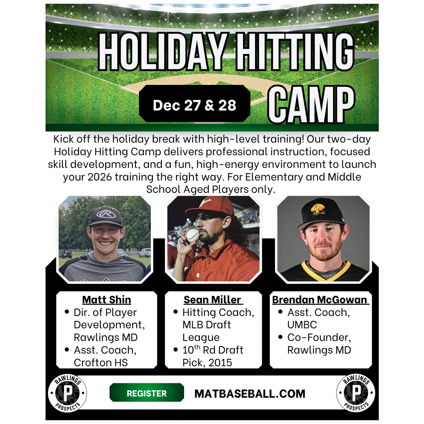 Kick off the holiday break with high-level training! Our two-day Holiday Hitting Camp delivers professional instruction, focused skill development, and a fun, high-energy environment to launch your 2026 training the right way. This camp will be led by Sean Miller, hitting coach in the MLB draft league, Brendan McGowan, assistant coach at UMBC, and Matt Shin, Director of Player Development here at Rawlings.